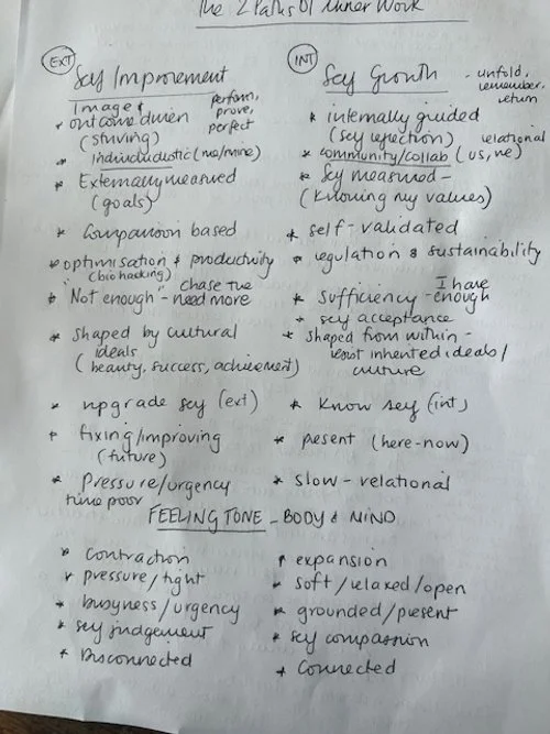 To be honest it’s really only over the last 4 or 5 years, with a very intentional stepping away from a lot of the messaging on social media, that I have realised there is a big difference between self improvement and self growth. So, I thought I would share my thoughts and a photo of a diagram I drew because my neurodivergent brain likes to see things visually. Mind mapping is one of the most effective ways a neurodivergent brain can organise and make meaning of complex ideas - I also work a lot with a whiteboard.